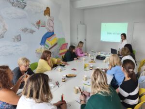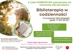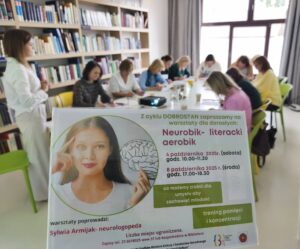 • warszaty dla dorosłych z cyklu Dobrostan ( 2 Biblioterapia w codzienności i 2 Nerobik- literacki aerobik)
